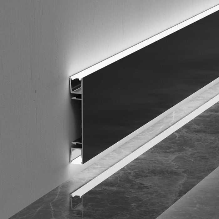 С применением данного товара вы можете реализовать любые свои идеи по освещению: скрытая подсветка под потолком, акцентное освещение на стенах или подчеркнутое зонирование пространства — всё это возможно благодаря плинтусу с рассеивателем.