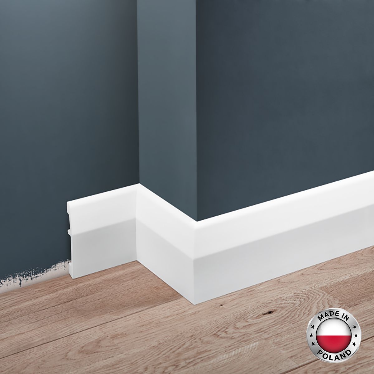 * Белый матовый цвет и гладкая поверхность плинтуса создают элегантный и современный вид помещения.