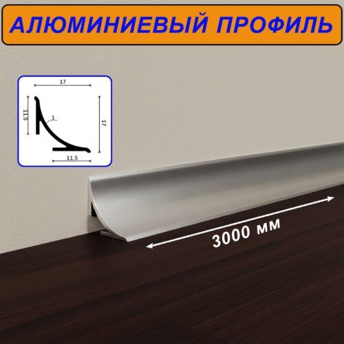 Плинтус алюминиевый для пола и столешницы, высота 17 мм, длиной 300 см,Серебро матовое, 5 шт