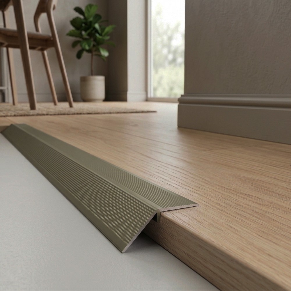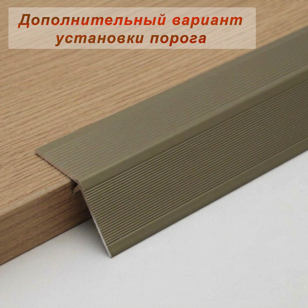 Алюминиевый разноуровневый порог Шампань матовый с перепадом 25 мм от бренда ЛЕОНИТО — практичное решение для создания эстетичных и функциональных переходов между различными уровнями напольных покрытий.