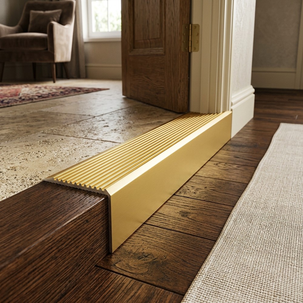 Латунный угловой порог Cezar подходит для использования как в домашних интерьерах, так и в коммерческих помещениях, где важны как стиль, так и функциональность.