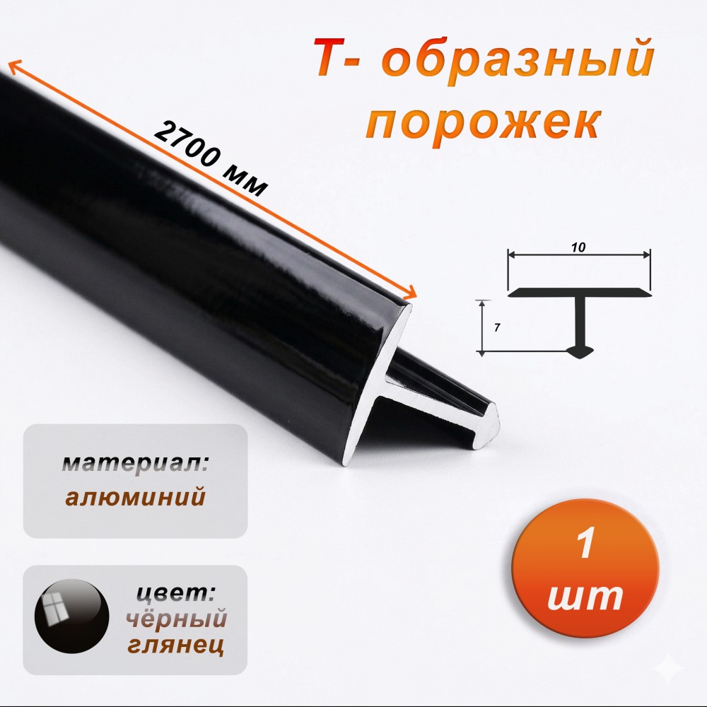 Порожек Т-образный для пола, 10 X 2700 мм, ножка 7 мм, алюминий, Черный глянец, 1 шт