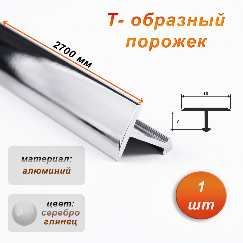 Порожек Т-образный для пола, 10 X 2700 мм, ножка 7 мм, алюминий, Серебро глянец,1 шт