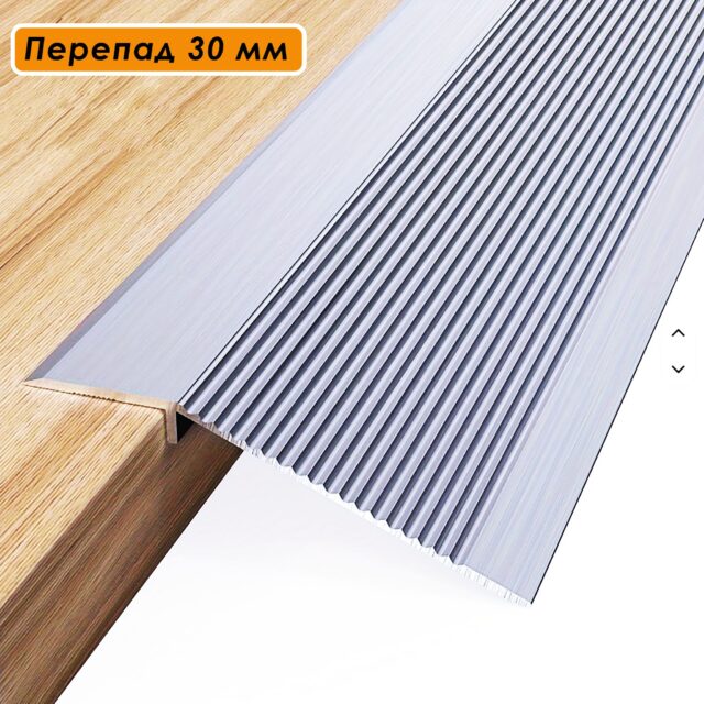 Алюминиевый разноуровневый порог Серебро матовое с перепадом 30 мм — практичное решение для создания эстетичных и функциональных переходов между различными уровнями напольных покрытий.
